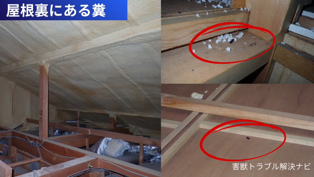 侵入口が多数あったため、屋根裏に入り調査をしたところ、屋根裏の汚損と糞尿による被害がありました。