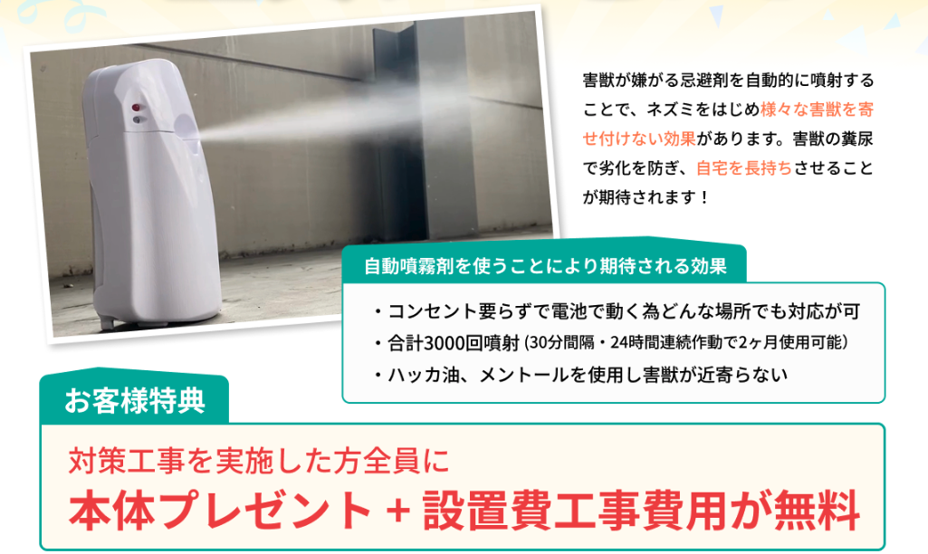 その中でも対策工事を行なった方向けに万が一のための再発予防キャンペーンがめちゃくちゃ手厚いです。ネズミ駆除をハウスガード24に依頼した方全員に害獣避け自動噴霧器と噴霧剤を全員プレゼントしてくれるキャンペーンが2026年1月からスタート。他社では施工+保証1年が多い中でここまで対応してくれるハウスガード24には安心してネズミ駆除をお願いすることができます。
